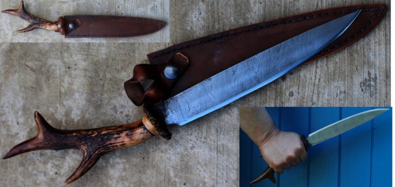 Bowie, blade d forged in fire damascus , hilt and handle in deer crown . Handle oriented for edge upwards to allow it to be disengaged and easily removed from the game after thrusting.