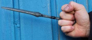 Dague kiss à trois pans forgée en H12MF ( D2 russe).Tranchants de 12.5 cm , lame inclinée comme dague gerber MK2 1967 . pointe diamant, simple et multiples, forgée à sa main et prises en main comme une dague , en pic a glace , en kérambit ou en push dagger , livré avec trois fourreaux. poids hors fourreau de 62 gr.