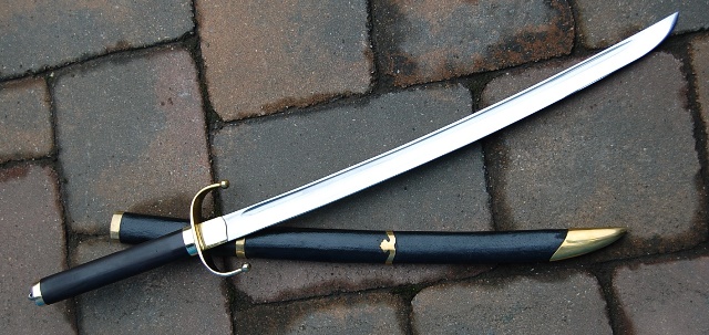 lame de 64 cm forgee en xc 75 avec trempe sélective ,garde et renforcements en fer forge , manche en gizo patine.
